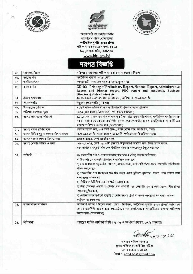 | GD-06a: Printing of Preliminary Report, PEC report and handbook, Business Dictionary etc. | অর্থনৈতিক শুমারি ২০২৩ প্রকল্প | 52.01.0000.63507.041.24.4096 Date: 18-02-2025 | 04-03-2025 | |