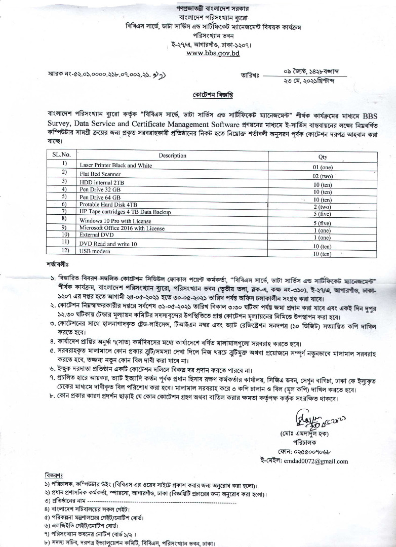 | কোটেশন বিজ্ঞপ্তি | বিবিএস সার্ভে, ডাটা সার্ভিস এন্ড সার্টিফিকেট ম্যানেজমেন্ট নিষয়ক কার্যক্রম | ৫২.০১.০০০০.২১৮.০৭.০০২.২১.৯৯ তারিখ: ২৩-০৩-২০২১ . | ||