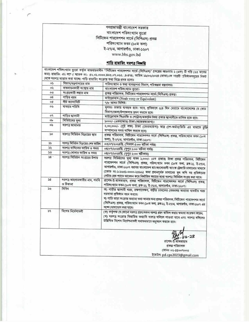 | গাড়ি হায়ারিং পুনঃদরপত্র/প্রস্তাব বিজ্ঞপ্তি | বাংলাদেশ পোভার্টি অ্যান্ড লাইভলিহুড স্ট্যাটিসটিক্স (BPLS) প্রকল্প | ৫২.০১.০০০০.৭২০.৩৯.০০১.২৫.১২৬ তারিখ: ২৮-০৯-২০২৫ | ০৯-১০-২০২৫ | |