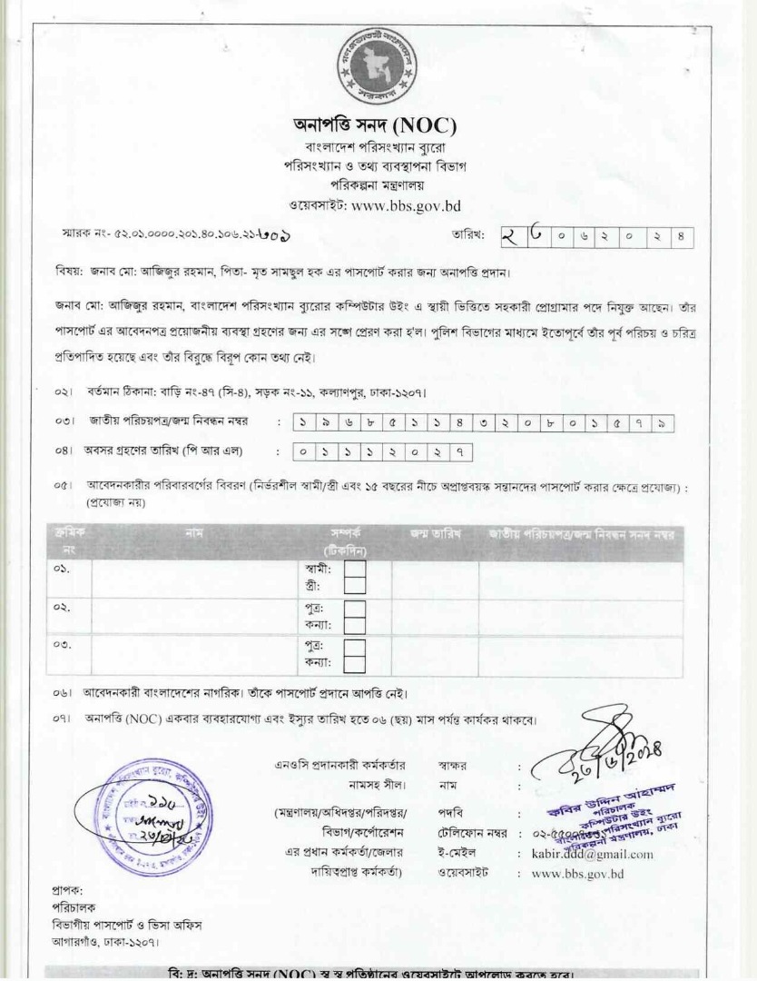 | জনাব কবির উদ্দিন আহাম্মদ, পরিচালক কম্পিউটার উইং, বিবিএস এর স্ত্রী এবং কন্যাদ্বয়ের আন্তর্জাতিক পাসপোর্ট করার নিমিত্ত বিভাগীয় অনাপত্তি সনদ | বাংলাদেশ পরিসংখ্যান ব্যুরো | ৫২.০১.০০০০.২০১.৪০.১৭০.২৩.৬৪৭ তারিখ:১৯-০৩-২০২৫ |