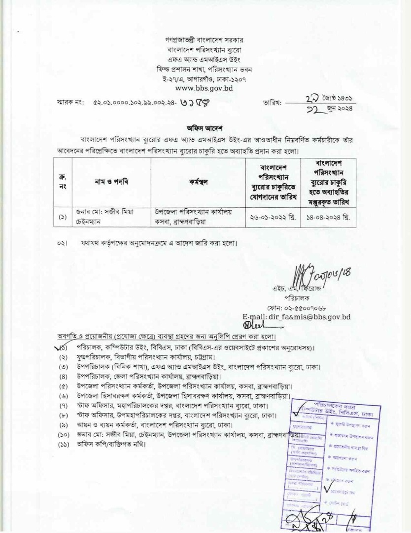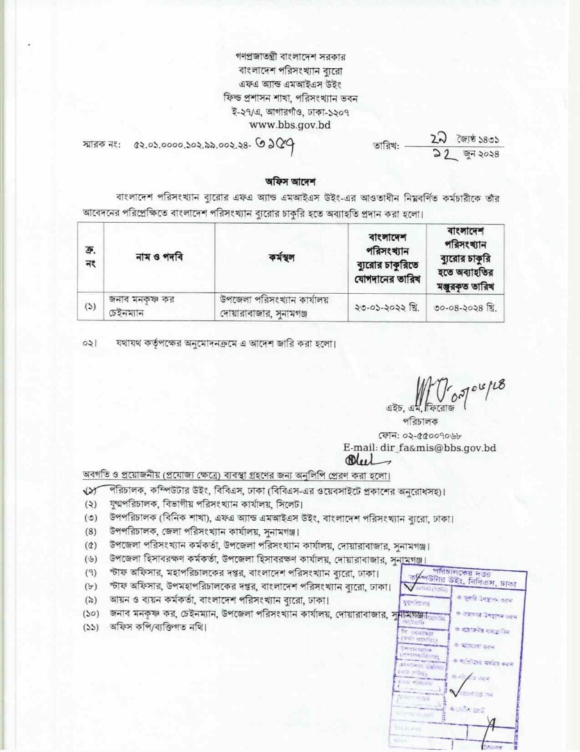 | জনাব মো. মনিরুজ্জামান, সহকারী পরিসংখ্যান কর্মকর্তা, মাধবপুর, হবিগঞ্জ | ৫২.০১.০০০০.১০২.১৯.০০৫.১৫.১২৯১ তারিখ-০৭-০৫-২০১৭ |