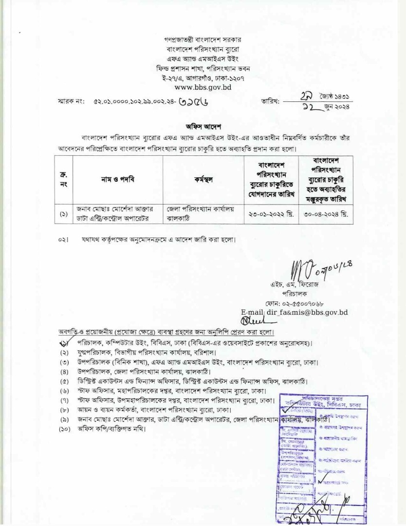 | জনাব আছাদুজ্জামান, সহকারী পরিসংখ্যান কর্মকর্তা এর বদলি | ৫২.০১.০০০০.১০২.১৯.০০৫.১৫.১৪৩২ তারিখ: ২৭-০৪-২০২৫ |