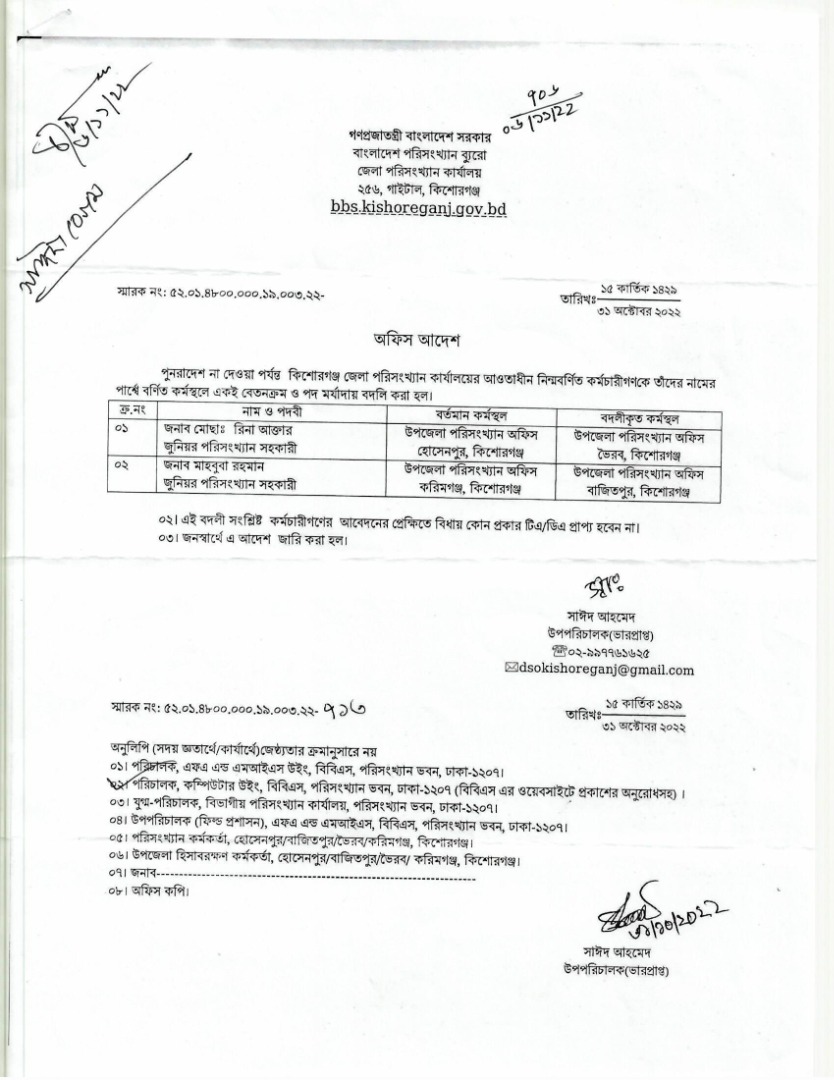 | জনাব মোঃ মাহমুদুজ্জামান, উপপরিচালক এবং জনাব আমজাদ হোসেন, উপপরিচালক | ৫২.০০.০০০০.০০৫.১১.৮৭৩.১৭-৪২৪ তারিখ: ১২-১০-২০১৭ |